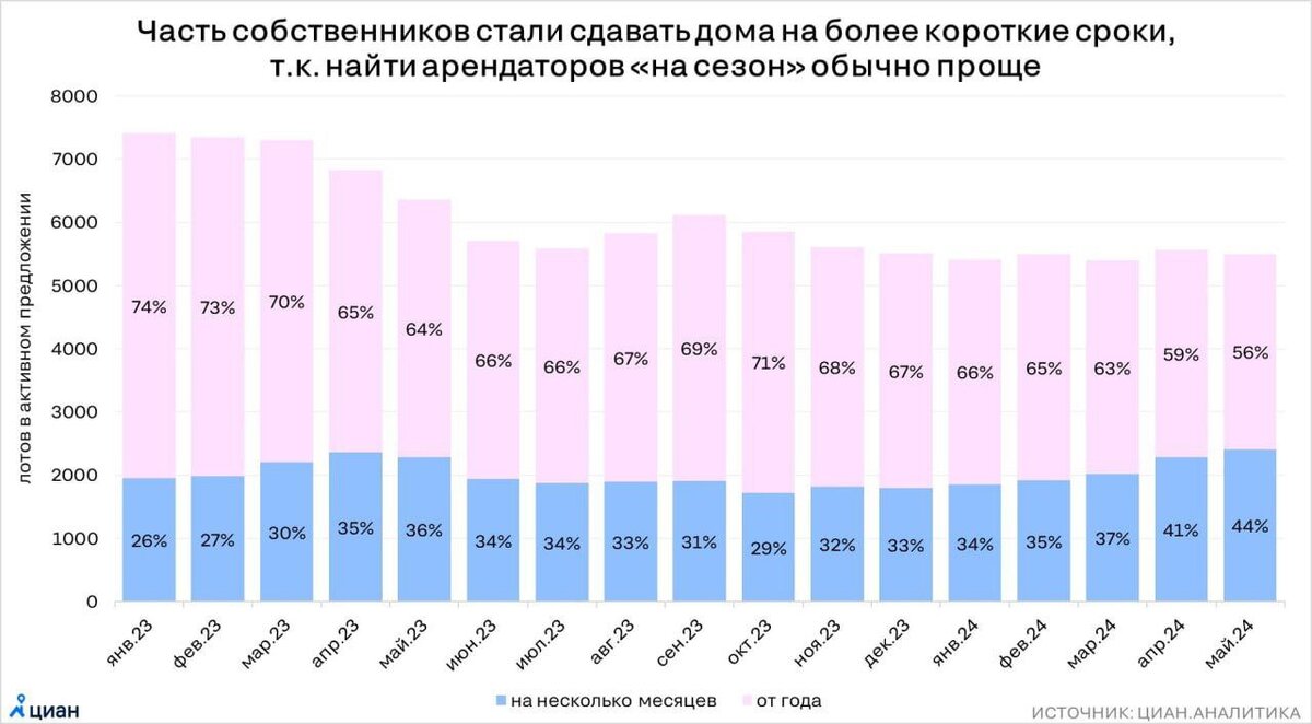 В России растёт число собственников, которые предпочитают сдавать свои частные дома в аренду на сезон, а не круглый год. Такой подход позволяет им легче находить арендаторов. По данным на май, доля таких собственников составила 44%. Традиционно рост доли краткосрочной аренды приходится на апрель–июнь, то есть обычно заселение происходит на летний период.
