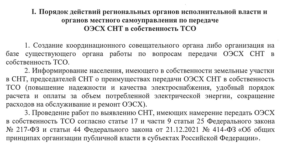 Начинаем цикл статей по анализу обобщенной практики порядка передачи объектов электросетевого хозяйства в собственность территориальных сетевых организаций, которая разработана Минэнерго и направлена в региональные органы власти письмом от 17.05.2024 г. № СЦ-7719/07. Общую информацию о документе и сам документ я уже опубликовал в предыдущей статье. Сегодня поговорим о первом разделе этого документа, который называется: "Порядок действий региональных органов исполнительной власти и органов местного самоуправления по передаче объектов электросетевого хозяйства СНТ в собственность территориальных сетевых организаций". Напоминаю, что данный документ не является нормативно-правовым актом и имеет рекомендательный характер, не обязательный для исполнения. Но несмотря на это, в отличии от предыдущего документа (Письмо Минэнерго РФ от 25.08.2017 г. № АН-9441/09) существующий документ несет больше пользы чем вреда. В первом разделе органам власти рекомендуется создать координационный совещател