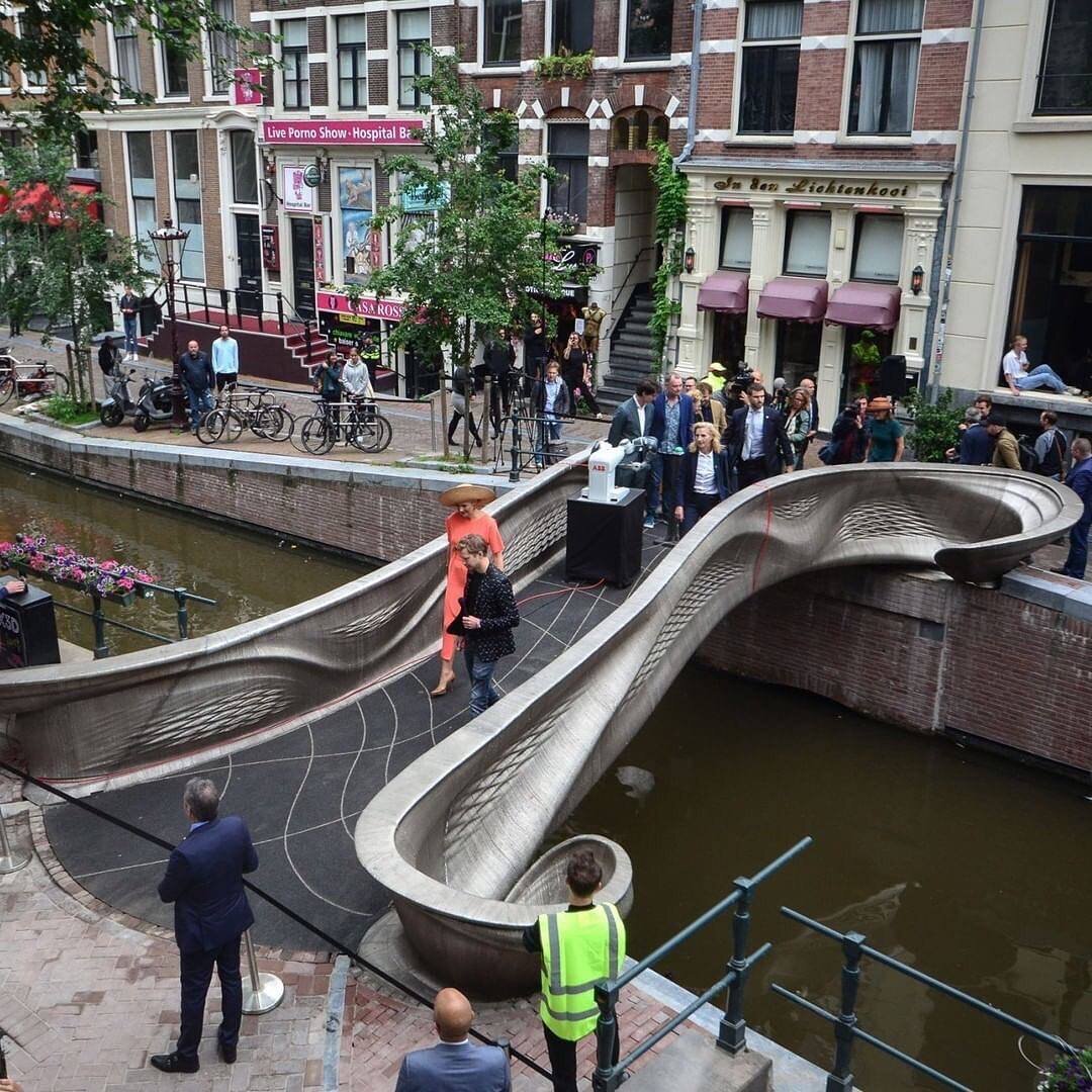 Мост был напечатан четырьмя роботами методом наварки слоев из проволоки из нержавеющей стали.
