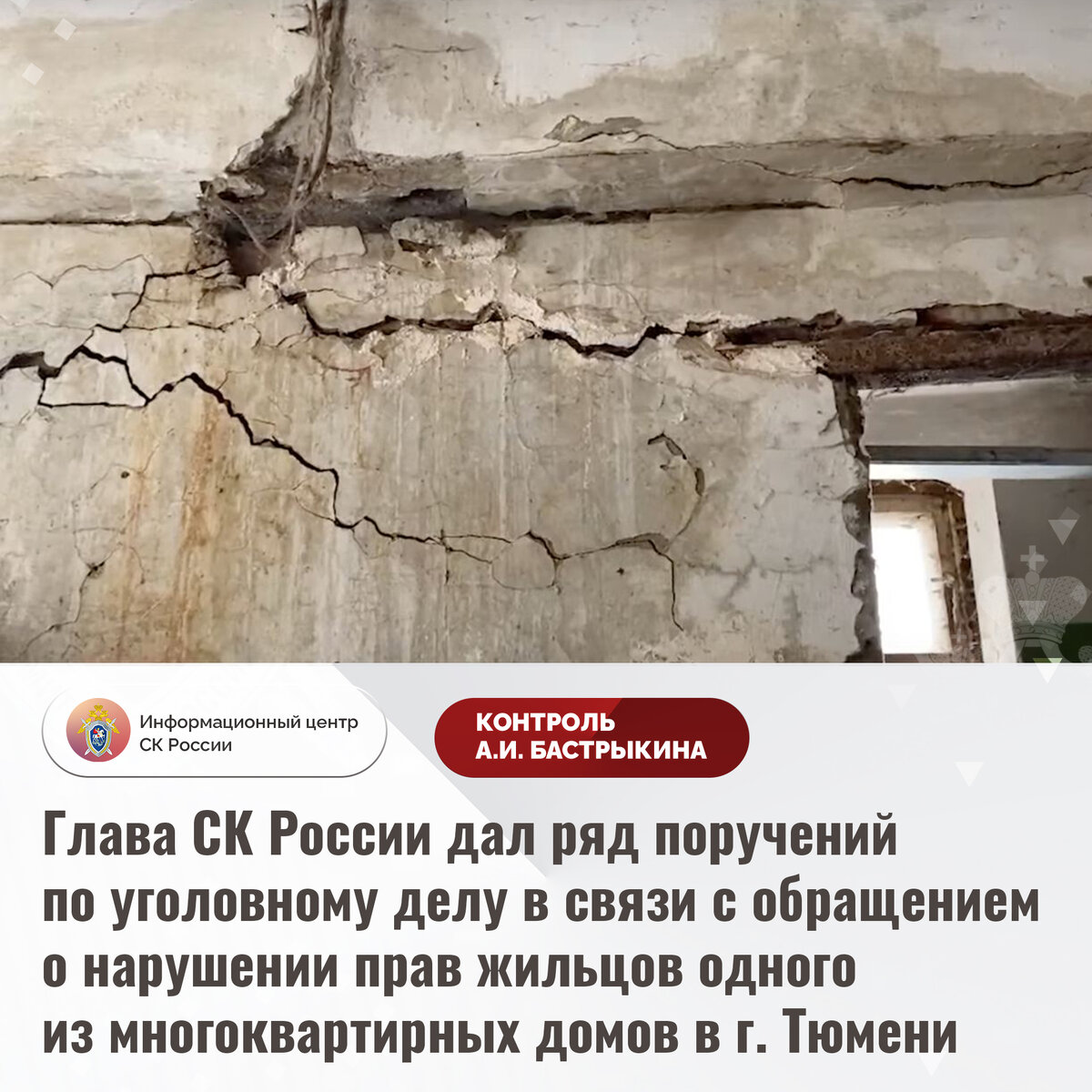 В комментариях в аккаунте Информационного центра СК России «ВКонтакте» поступило обращение о несогласии с результатами установления обстоятельств нарушения прав жильцов многоквартирного дома по улице Индустриальной в городе Тюмени. В здании, 1960 года постройки, имеются многочисленные технические повреждения, в том числе трещины в стенах, протечки систем водоотведения и водоснабжения, неисправна электропроводка. Граждане, среди которых пенсионеры, инвалиды и несовершеннолетние, вынуждены проживать в небезопасных условиях.