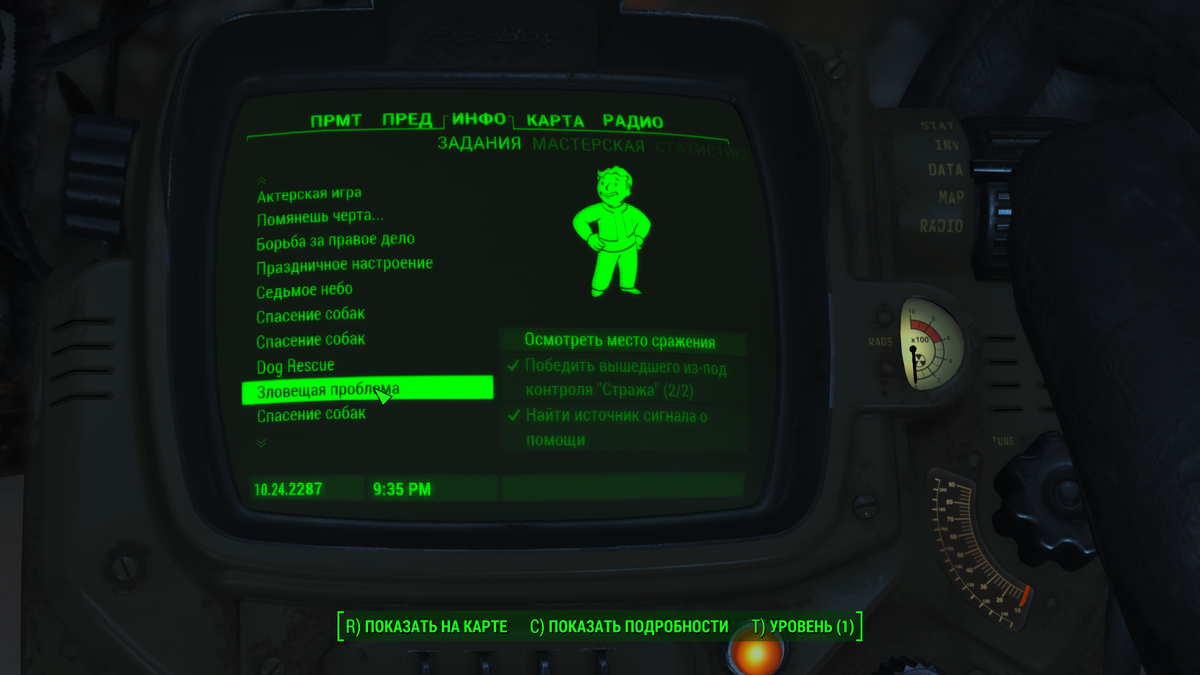 Всем привет! Сегодня разберем новый (как минимум для меня) квест – Зловещая проблема. Выловил я его по дороге к Дайменд-сити, когда на меня напали два Стража. Выглядит это как две взбесившихся брони, так как эти железные ребята уже грохнули члена Братства стали, которого вроде как должны были охранять. Кстати, гасятся они будь здоров, так что осторожно – квест однозначно для хороших уровней, а не для бомжа начала игры. После детального изучения железных останков и трупа Марии из БС выясняется, что корень проблемы находится на газовой станции. Любопытный момент. По пути к газовой станции нашел вот такого торговца. В ассортименте у него была кошатина (собачатину я помню, а вот такое мясо вижу впервые). Но не в этом дело. Вот его двор: А вот его комната: Любитель кошек, блин. Очень хотелось его завалить не отходя от кассы. Я вообще люблю всяких пушистых мурлычущих и лающих. Вдруг кто решит наказать, эта сволочь живет здесь: Вернемся к квесту. На станции обнаружился еще один агрессивный ти