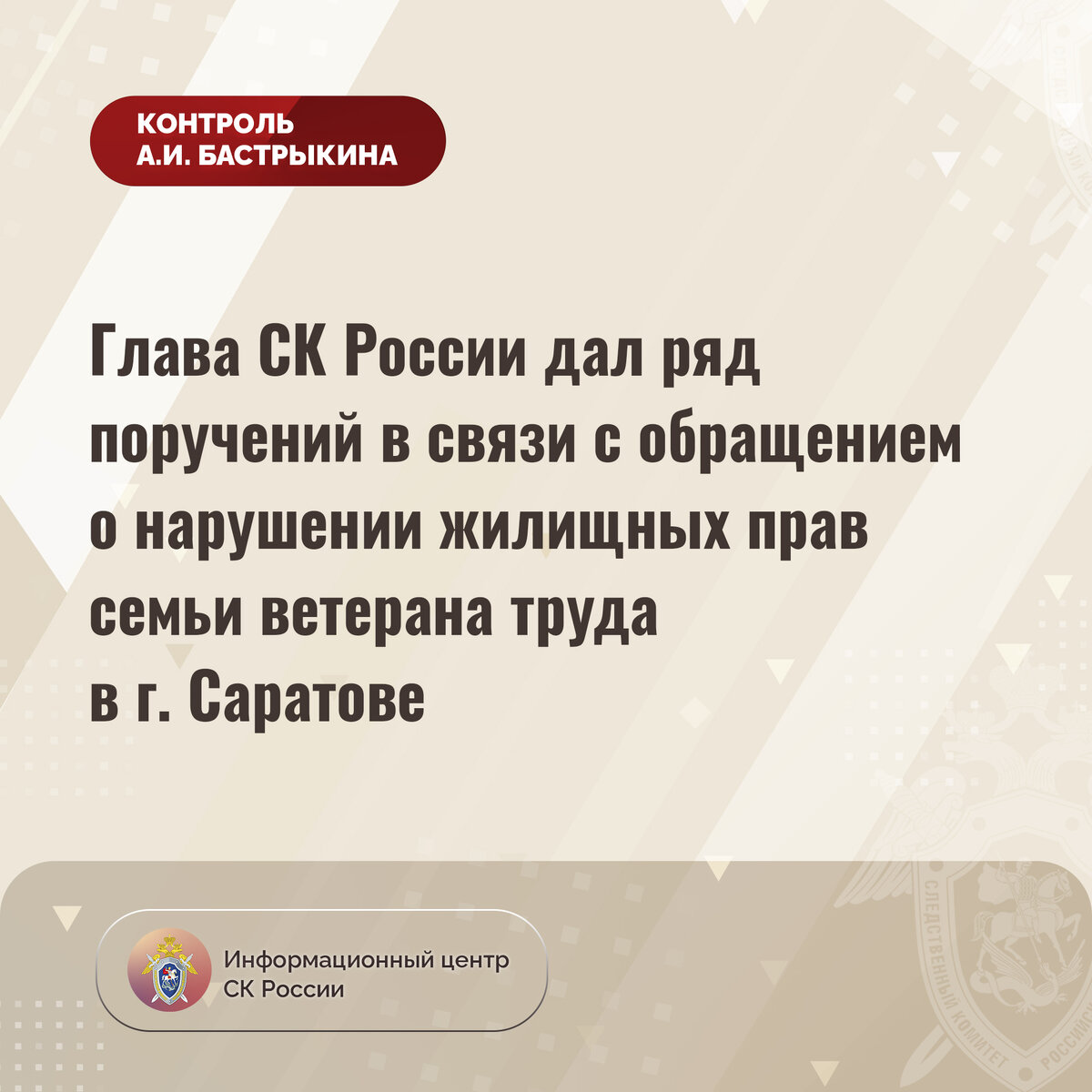 Глава СК России дал ряд поручений в связи с обращением о нарушении жилищных прав семьи ветерана труда в г. Саратове