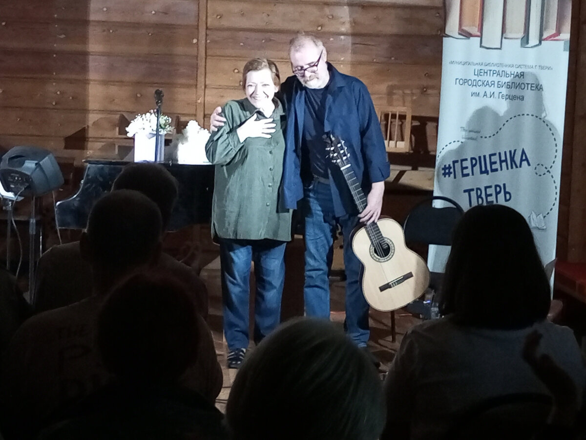 Ольга сразу призналась – концертные костюмы они забыли в Рязани, откуда приехали к нам. «А потому мы у вас по-домашнему». И очень домашнее, уютное получилось общение. Несмотря на то, что за долгие годы творчества этого дуэта концерт в Твери – первый, казалось, в зале собрались старые друзья. Частично так и было – приезд в Волговерховье состоялся по приглашению тверского барда Аллы Мишенькиной, которая, кстати, и их песни удивительно исполняет, а также сообщества «В твердом переплёте» https://dzen.ru/id/64d4812cc09280390daa0107 , собирающего под свою обложку интересных авторов и думающих читателей. Кроме того, на концерт в Тверь приехали друзья издалека. Ольга их узнавала в зале и радостно приветствовала. Это выступление стало первым в Волжском туре, который закончится 9 июня в Астрахани. А в промежутках будут Пенза (пусть и не на Волге), Саратов, Волгоград.