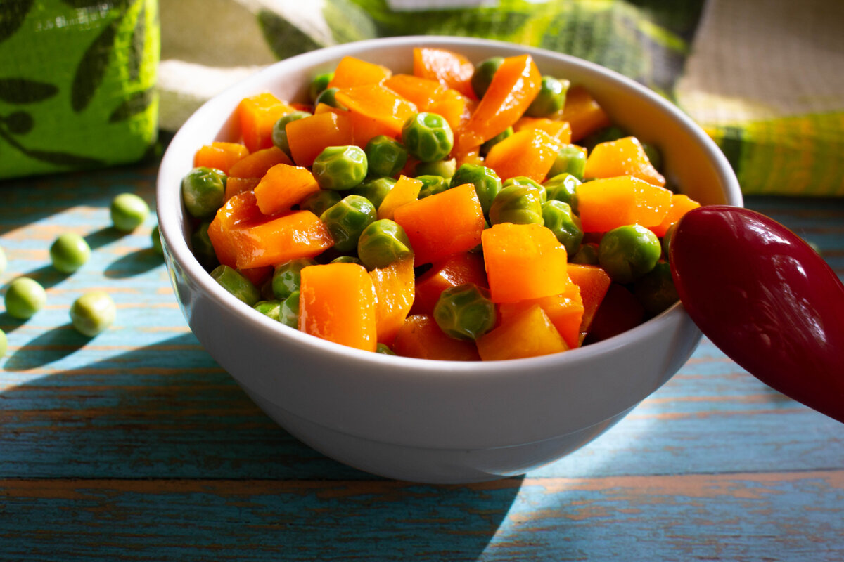 Такое блюдо можно приготовить не только на гарнир, оно отлично заменит порцию обеда или ужина. Тушеную морковь можно предложить вегетарианцам или если вы просто хотите отдохнуть от калорийных или мясных блюд. Постящимся вместо сливочного масла можно использовать растительное. Готовится этот яркий гарнир просто. Для приготовления нужны молодой горошек и молодая морковь. Это блюдо исключительно для любителей моркови. Не все ее любят. Ингредиенты: Морковь - 1 стакан Горошек зеленый молодой - 400 г. Масло сливочное - 3 ст.л. Сахар коричневый - 25 г. Сок лимонный - 1 ст.л. Соль - 2 щепотки Перец черный молотый - 1 щепотка Морковь нарежем мелкими кубиками. Нам нужен стакан нарезанной моркови. Выложим морковь и сливочное масло в посуду, в которой удобно будет готовить. Тушим морковь минут 15-20, помешиваем. Добавим в кастрюльку свежий зеленый горошек. Добавим сахар. Морковь сама по себе сладкая, но в рецепте все равно есть сахар. Если вы не любите сладковатые блюда, то сначала попробуйте гарн