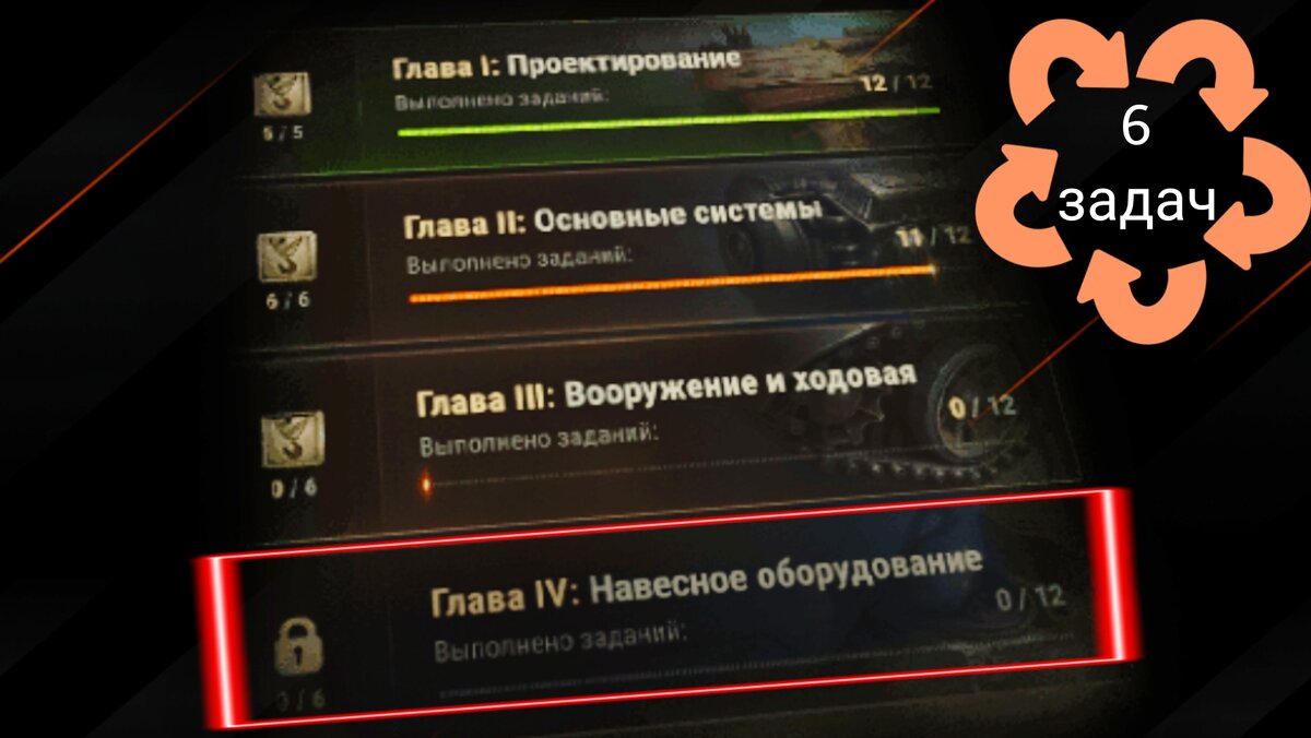 Привет танкисты! Уверен, что многие из вас уже столкнулись с тем, что четвёртая глава сборочного цеха просто так не сдастся на милость победителям и СУ-122 (1956) заставит напоследок вспотеть даже самых бывалых игроков. В этой статье я расскажу вам какие задачи ( на мой взгляд ) будут менее затратны по времени прохождения и вообще как и на чем проходить 4 главу цеха. Погнали! Но для начала надо просмотреть все имеющиеся задачи этой глава ,которая так и называется - Навесное оборудование: Задачи: ⭕Победить 12 раз, нанеся 1000 ед. урона в каждом победном бою ⭕ Заблокировать 20 000 ед. урона за любое количество боёв ⭕ Повредить 3 машины противника в каждом из 30 боёв ⭕ 16 раз попасть в топ-3 своей команды по «чистому» опыту ⭕ Нанести 140 000 ед. урона противнику за любое количество боёв ⭕ Уничтожить 15 лёгких танков противника за любое количество боёв ( на лёгких танках) ⭕ Нанести урон 240 машинам противника за любое количество боёв ( на средних танках) ⭕ Уничтожить 24 тяжёлых та