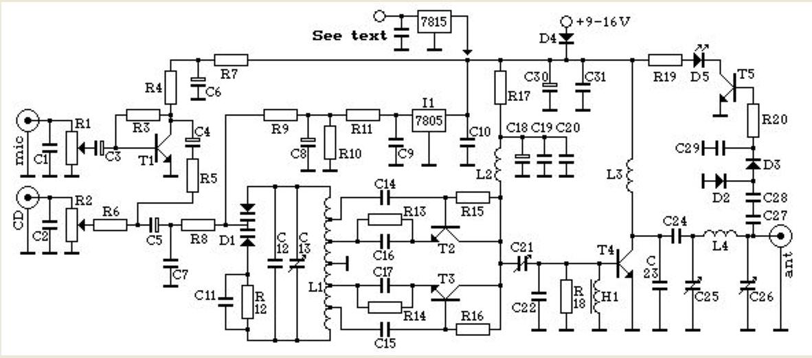Между R8 и C21 находится каскад FM модулятора , который, собственно, генерирует радиосигнал. Диод D1 – так называемый “варикап”, который можно представить как переменный конденсатор, управляемый уровнем звукового сигнала. Он, C12, 13 и катушка L1 определяют частоту. Модулятор представляет собой, по существу, два генератора, работающих в противофазе на частоте около 50 МГц. Когда сигналы этих генераторов комбинируются, получается 100-мегагерцовый сигнал. Такая схема, как правило, гораздо стабильнее одного гетеродина, работающего на частоте 100 МГц. Сигнал затем усиливается до 1 Вт в оконечном каскаде на транзисторе T4.