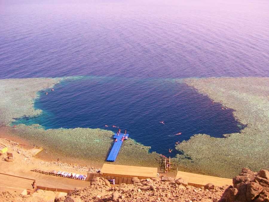 Голубая дыра (Blue hole) - это вертикальная подводная пещера, находящаяся в 15 км к северу от города Дахаб, в непосредственной близости к берегам пустыни. Это место не случайно называют "Кладбищем дайверов" или "Самым опасным местом для погружений в мире". Многие жизни были унесены этим подводным маршрутом, даже несмотря на ясную карту его прохождения. Идея экстремального погружения заключается в спуске через дыру El Bells и преодолении арки из подводных рифов для последующего всплытия на поверхность по удобному деревянному мостику в самой Голубой дыре. Однако, даже опытные дайверы с качественным снаряжением иногда становились жертвами таинственных глубин. Существует легенда, согласно которой в давние времена в этом районе жил эмир, у которого была дочь. Пока эмир уходил на военные походы, его дочь занималась развратом с местными юношами. Для того чтобы скрыть скандальные слухи о её поведении, бедняг тонули в бесконечной яме. В конце концов, эмир узнал о порочной жизни своей дочер
