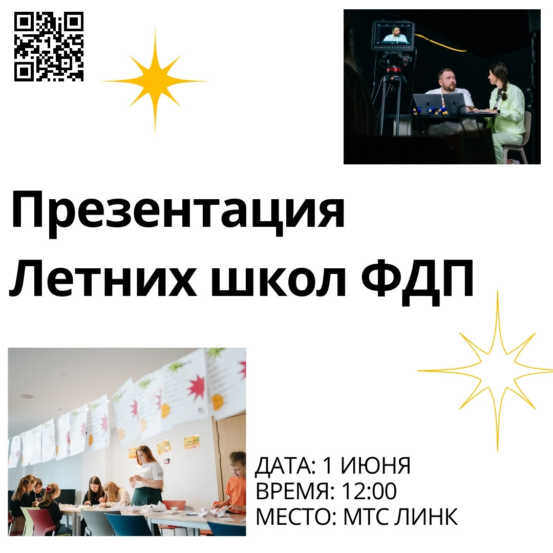 Друзья, внимание: мы рады объявить о предстоящей презентации Летних школ ФДП для школьников! Хотите, чтобы ваши дети интересно и продуктивно провели летние каникулы, получили знания и навыки, познакомились с новыми друзьями и провели время с пользой? Мы приглашаем всех желающих на презентацию, где вы сможете узнать подробную информацию о программах Летних школ, расписании, преподавателях, а также задать все интересующие вас вопросы. Презентация состоится 1 июня в 12:00 на платформе МТС ЛИНК.