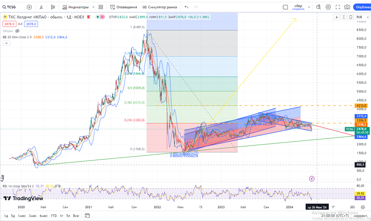 С прошлого года все присматривалась к акциям Тинькоффа банка. До позавчерашнего падения всего на свете, была надежда на разворот и то, что акция останется в рамках растущего канала. Но видимо не судьба. Газпром и потом НЛМК подтолкнули падающего. И есть шанс, что до конца года так и будет плестись до поддержки. Собственного драйвера роста в виде дивидендов пока не наблюдается. Так же видно, что после падения, ЭТО даже не пыталось корректироваться до уровня 23% по Фибоначи от исторического максимума ноября 2021 года. Можно предположить, что не растет, потому, что до уровня истхая его задрали искусственно в 2021 году и исключительно с целью последующей перепродажи задорого. То есть оно столько не стоило бы в реальности никогда. Браво маркетологам продававшим этот банк. Оценка 6+. Мораль: не все то золото, что имеет дорогой ценник. Еще из графика можно предположить, что следующий максимум будет выше.