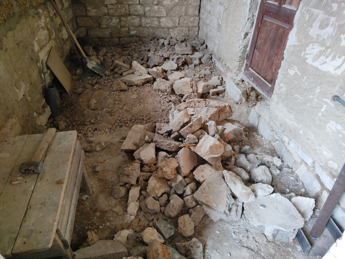 Когда мы переехали в наш дом, многие бытовые моменты были еще не устроены, попросту не успели, начиная от отсутствия воды и места где можно принять душ, до отсутствия условий и порядка на кухне. Точнее вода была, но только лишь в виде крана с холодной водой на улице, а так как мы переехали в начале апреля и временами было очень даже прохладно, умываться и мыть посуду на улице ледяной водой было то еще удовольствие. Само собой первоочередной задачей было обустройство временного водопровода, подключения бойлера, стиральной машинки (как без нее) и еще придумать какое то сооружение, в котором можно принять душ. Но было одно "но", мы не могли этого сделать до того, как закончим расчищать полы в пристрое, потому что все эти коммуникации мешали бы работе. Ввиду этого первоначально все силы были брошены на эти полы. И вот тут нас ждал сюрприз в виде огромного количества камней и строительного мусора смешанного с землей. По времени и трудозатратам вышло больше чем остальной пол во всем доме.