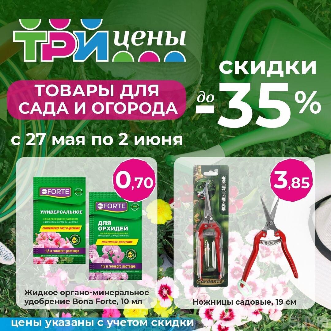 Скидки в магазинах "Три цены" Товары для сада и огорода со скидками до 35% с 27 мая по 2 июня Остальные предложения смотри тут! Акционные предложения с 20 мая по 2 июня