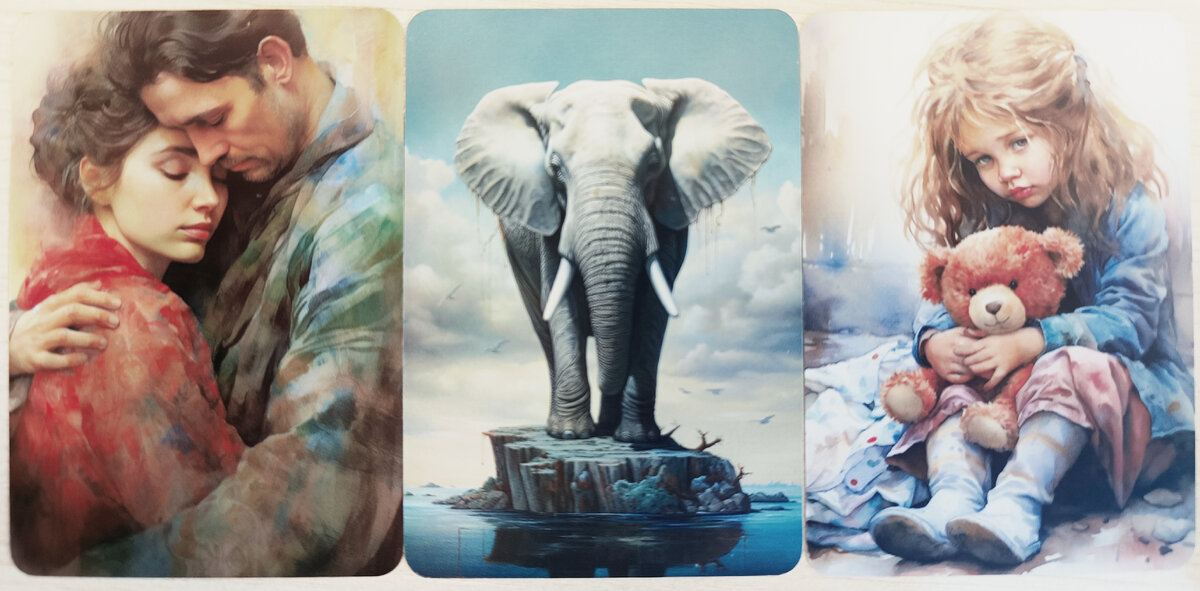 База... Ощущение от слона как-будто именно на нём держится этот мир... Он - это база, основа... С одной стороны от него пара, с другой - ребенок. Наше детство это та база, на которой потом строятся наши отношения с собой, миром, окружающими людьми... Важно обратить внимание на своиих внутренних родителей и ребенка. ..