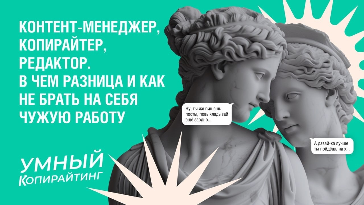 Привет, друзья! Сегодня обсудим разные названия одной и той же профессии и, возможно, придем к выводу, что отличия все же есть — и они важны. В чем же специфика разных ответвлений копирайтинга? Собственно копирайтер, он же автор — человек, который пишет тексты. Возможно, он придумывает сам, какие тексты ему писать, или же делает материал по ТЗ от маркетолога, редактора или кого-нибудь еще. Контент-менеджер — более организационная работа. Контент-менеджер, скорее, отвечает не за суть контента, а за его размещение: публикует, анализирует, делает выводы. Редактор — в целом, как и автор, может писать ручками, но несет бОльшую ответственность. Например, копирайтер напишет статью, а к нему придет редактор с правочками. Проблема в том, что в разных компаниях и проектах это все работает по-разному. Например, одни ищут копирайтера и ждут, что тот будет заниматься аккаунтингом. В мире других контент-менеджер должен не только писать, но еще и пилить сторис/снимать рилзики. Как с этим жить?