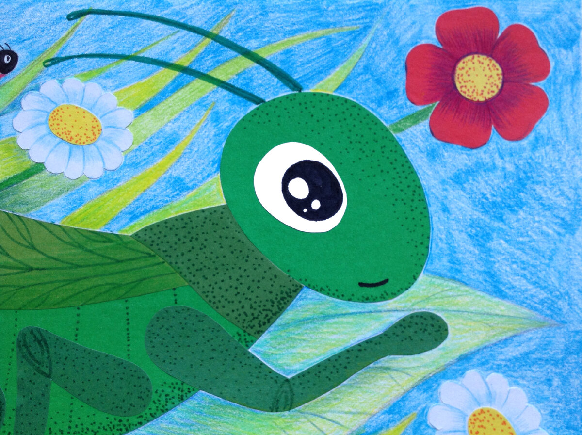 Заканчиваем композицию прорисовыванием деталей фломастерами: рисуем кузнечику глаз, улыбку, усики, точками подчеркиваем фактуру поверхности тела, дорисовываем божью коровку, в сердцевинках цветах обозначаем точками тычинки.