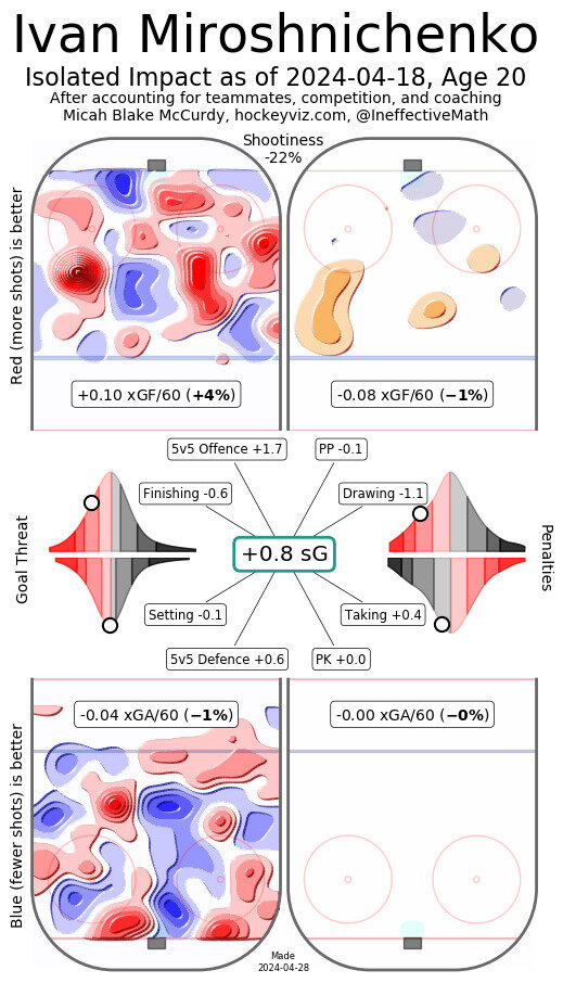 Предлагаем вашему вниманию подробный отчет о выступлении Ивана Мирошниченко в прошедшей кампании от вашингтонского журналиста Питера Хассета из RMNB. Мирошниченко в этом сезоне проявил себя в НХЛ хорошо, но команда, переживающая не лучшие времена, не позволила нам увидеть его истинный потенциал. Взглянем на общую статистику россиянина в регулярном чемпионате 2023-2024 2 гола и 4 ассиста в 21 матче, 12:10 – среднее игровое время. 47,6 – процент попыток броска при игре пять на пять, 52,2% – ожидаемый процент голов при игре пять на пять, 38,9% – фактический процент голов при игре пять на пять. Анализ активности игрока на каждом участке площадки от HockeyViz В верхней части изображения показана активность в нападении (слева – в равных составах, справа – в большинстве), а в нижней – действия в защите. В каждом случае красные/оранжевые пятна означают, что хоккеист наносит больше бросков по воротам с этого места на льду, а синие/фиолетовые – меньше. Схема в середине – сопоставление показателе