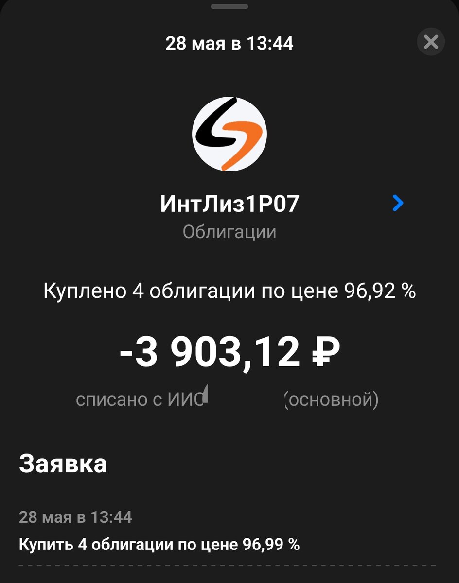 Сегодня день зарплаты. Со своей пополняю ИИС№1 синего брокера на 4.000р. Покупаю, как обычно, облигации Интерлизинг 7 (новые) .