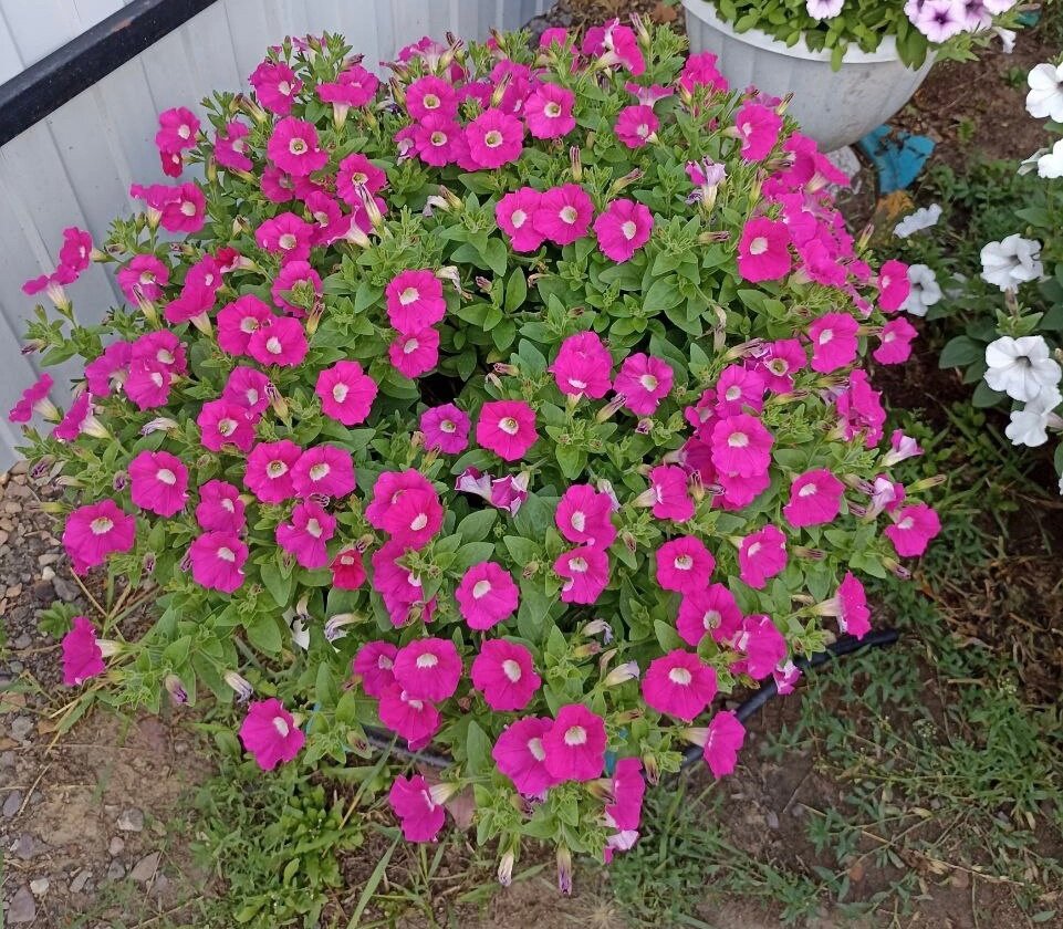Петунии можно выращивать как в горшках, так и в открытом грунте на клумбах. От последнего способа я не так давно полностью отказалась. Расскажу, почему. А так же поделюсь своими наблюдениями, как выращивать петунию, чтобы она росла пышным кустом и цвела, как говорят цветоводы «пышной шапкой». Но сначала о том, чем мне не нравилось выращивать петунию в открытом грунте. Больше проблем с вредителями и грибком Заметила, что петуния, растущая в открытом грунте, чаще страдает от вредителей – нападок тли и паутинного клеща. Кроме того, на клумбе выше риск поражения грибком. В горшках петуния у меня вообще ни разу не поражалась грибком, даже без профилактических обработок. А вот вредители, конечно, все равно добираются. Но на страже всегда Фитоверм. Мокнет под дождем После обильных ливней петуния теряет свою красоту: портятся уже раскрывшиеся бутоны, куст разваливается. А вот если петуния растет в горшках, перед дождем их можно быстренько перенести под навес или в беседку. Конечно, это удобно,