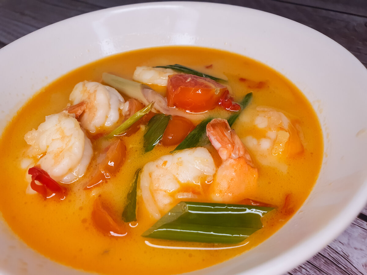 Если вбить "том ям" в поисковик, то почти все результаты поиска обязательно будут обещать вам, что именно этот вот рецепт самый настоящий, правильный, аутентичный и тру-тайский. Видимо, подразумевается, что все остальные рецепты не настоящие и не тайские. Кстати, при этом те самые "настоящие" рецепты могут довольно существенно друг от друга отличаться. Так в чём же тут дело? А все до банального просто. Никакого "настоящего" рецепта том яма просто не существует, это общее название для довольно обширной группы кисло-острых тайских супов с лемонграссом. В нем опциональны рыба, морепродукты, грибы, курица, и даже кокосовое молоко тоже не обязательный ингредиент, хотя в этот раз я его как раз использовала. Нам понадобится: 350 гр креветок, 9-10 помидорок черри, кубик имбиря шириной 1 см, 2 зубчика чеснока, 2 стебля лемонграсса, 3 стебля зелёного лука, 4 веточки кинзы, лайм, 200 мл кокосового молока, 350 мл куриного бульона, 1 ст.л. устричного соуса, 0.5 ч.л. острого соуса, 1 ст.л. сахара,