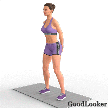 Как выполнять: Ноги стоят на уровне ключиц. Сделайте приседание до параллели бедер с полом, после чего выталкивайтесь наверх, но не подпрыгивайте. В пиковой фазе руки поднимаются над головой, туловище растягивается, а вес тела поднимается на носках. После маленькой задержки опускаемся и совершаем очередное повторение.