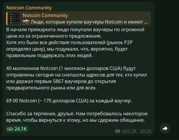 Ноткоин разошлет компенсацию тем, кто купил ваучер по большой цене