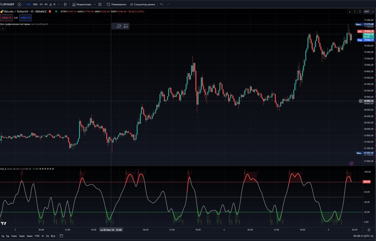 Индикатор CCI (Commodity Channel Index):CCI колеблется между положительными и отрицательными значениями. Значения выше 80 могут указывать на перекупленность, а ниже -20 на перепроданность.