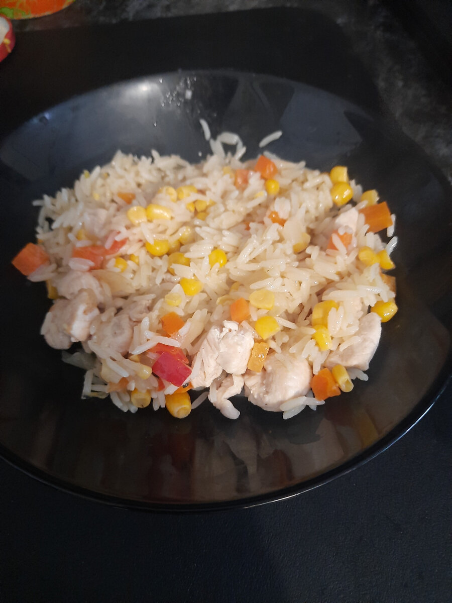 Простой, вкусный и быстрый рецепт. Готовится 30 минут. Ингридиенты: Итак, прейдем к самому процессу приготовления. Для этого блюда подойдет любая сковорода. Сначала необходимо нарезать курицу небольшими тонкими кусочками. Не переживайте, если кусочки не будут одинакового размера, главное следите, чтобы резали вы вдоль волокон, а не поперек. Разобравшись с мясом займитесь сладким перцем. Аккуратно разрежьте и почистите его от семечек и нарежьте кубиками с шириной грани где-то 1 см. Также почистите морковь и нарежте небольшими кубиками. Следующий этап – мелко нарезать лук. Пока режете лук поставьте разогреваться сковороду. Масло добавьте, когда сковорода начнет нагреваться, так аромат оливкового масла передастся и вашему блюду. Когда сковорода нагреется, выложите мясо. Его нужно обжарить на среднем огне в масле и выложить. На эту же сковородку положите лук, морковь и сладкий перец. Как только лук станет прозрачным, добавляйте рис, кукурузу, влейте 1 стакан воды, посолите и поперчите и