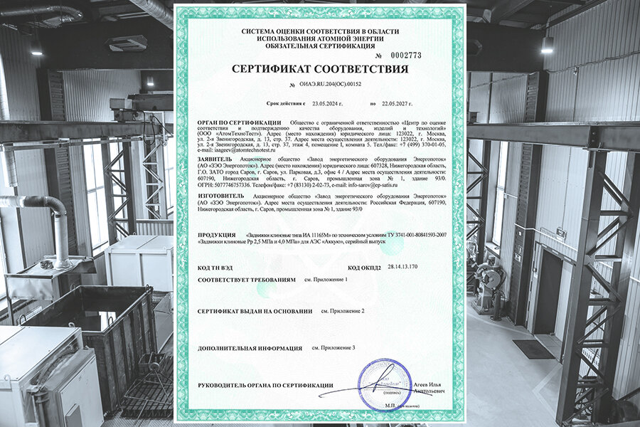 В апреле-мае 2024 года органом по сертификации ООО «АтомТехноТест» (г. Москва) была проведена оценка соответствия задвижек клиновых типа ИА 11165М в форме обязательной сертификации, согласно требованиям раздела VIII НП-071-18. Параметры задвижек клиновых типа ИА 11165М: условный проход DN400, Рр до 2,5 МПа и 4,0 МПа при Тр до 250˚С, материал корпуса – углеродистая сталь. Срок действия сертификата соответствия: с 23.05.2024 г. по 22.05.2027 г. Справка: АО «ЗЭО Энергопоток» занимается изготовлением трубопроводной арматуры для АЭС в связи с большой потребностью в данном оборудовании при строительстве новых и эксплуатации уже построенных блоков АЭС. Параллельно АО «ЗЭО Энергопоток» планирует в дальнейшем осваивать арматуру для тепловой энергетики и нефтегазового комплекса. Парк