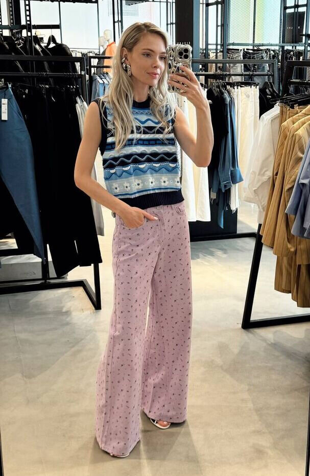 Марианна Елисеева совершает «набеги» на магазины и показывает модницам, где стоит искать актуальные вещи для гардероба. В очередной раз стилист опубликовала фотографии с образами, которые подобрала во время похода по бутикам. Один из образов привлек наше особое внимание, потому что составлен он в образе coquette core. Это веяние моды воспевает изящество и ретростиль. Эстетика кокетки подразумевает одежду с рюшами, цветочками, кружевом, бантами и другими романтическими элементами. Елисеева умело подбирает вещи так, чтобы образ в стиле coquette core не смотрелся чрезмерно миленьким. Она собрала такой аутфит, что его хочется повторить. Марианна Елисеева Лавандовые брюки клеш Марианна сочетала с интересной жилеткой. Орнамент, на первый взгляд, не очень хорошо стилизуется с романтическими цветами на брюках. Однако образ Елисеевой получился гармоничным. Жилетка, которую блогер надела без водолазок и рубашек, не выглядит инородно и неуместно. Марианна дополнила свой оригинальный лук простыми