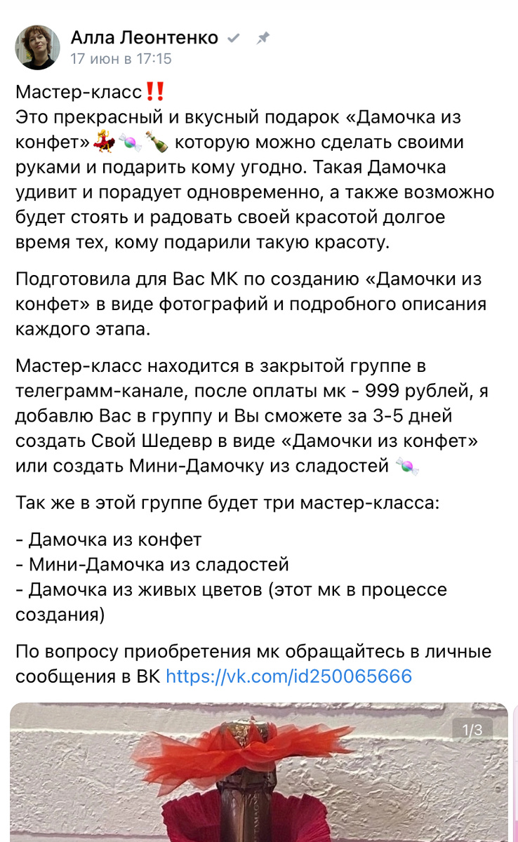 Доброго Благословенного Дня☀️ После создания платного мастер-класса по «Дамочке из конфет» ко мне пришла идея сделать Дамочку из живых цветов 🌺 (но это пока задумка). А Благодаря вчерашнему видео «Произведение искусства нейросети» у меня появилась Новая Идея по созданию Дамочек из фруктов и сладостей, кстати тоже оригинальная тема! Такую Даму можно поставить на праздничный стол и украсить не только фруктами, можно даже разные закуски в виде канапе 🍢 вставить - полёт фантазий неограничен!! И не теряя времени Хочется Творить и Творить🙌🏻🧚♀️ Да, сегодня проснулась с этой мыслью, прям подъём в душе какой-то ощущаю 🔥 Вы тоже можете сотворить свою Дамочку и причём любую, как и из бумажных розочек с конфетками, так и с оформлением фруктов и разноцветных зефирок, так и с живыми цветами - очЕнь оригинальный подарок получится!! В моём мастер-классе всё подробно расписано и показано, весь свой опыт вложила в МК. Также буду пополнять его Новыми работами, цена повышаться из-за это