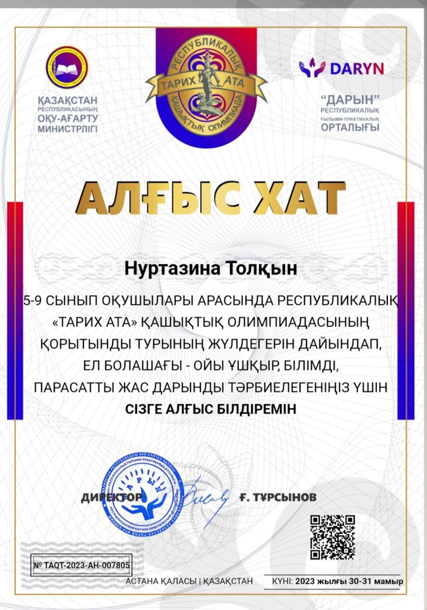 Мұғалім жетістігі. Оқушыларымды Тарих Ата байқауы қатыстырғаным үшін
