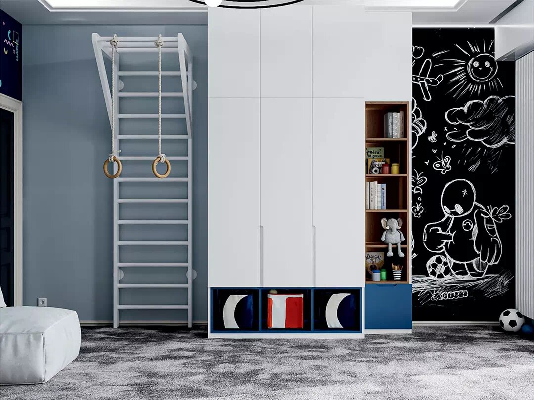 Мебель в детскую комнату для мальчика с двухъярусной кроватью-домом, рабочим местом, доской для рисования, спорт уголком. Кликайте и смотрите Мебель в детскую мальчика изготовлена в современном стиле и отлично адаптируется в окружающее пространство. Интерьер оформлен в спортивной тематике, с преобладанием белого и серого тонов. Акцентная стена, на которой изображены космонавты, играющие в мяч – синяя, с яркими деталями. Рядом с ней, на светло-сером ковре, устилающем всю поверхность пола, установлено мягкое бескаркасное кресло. Слева от входа размещается спортивный уголок. Ребенок может выполнять упражнения на шведской стенке, турнике и гимнастических кольцах. Для хранения вещей предназначен вместительный четырехсекционный шкаф с антресольным пространством. В трех секциях – по две распашных дверцы и глубокая полка-ниша внизу. Четвертая выполнена в виде открытого стеллажа с нижним выдвижным ящиком. Рядом с ней – черная настенная доска для рисования мелом, высотой до потолка. Слева от окн
