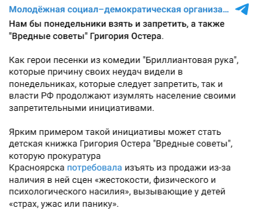В соцсетях распространяют слух, что самое известное произведение писателя Григория Остера «Вредные советы» требуют изъять из продажи. Якобы причиной стали «описания жестокости, физического и психологического насилия, антиобщественные действия, вызывающие у детей страх, ужас или панику». В действительности же речь идет об одной книге, в которой обнаружились провокативные картинки. По мнению прокуратуры Красноярского края, иллюстрации содержат сцены жестокости, а у издания отсутствует соответствующая возрастная маркировка, что нарушает законодательство. Претензий к тексту и автору у правоохранителей нет. Прокуратура региона не намерена направлять исковое заявление в суд с требованием изъять или уничтожить весь тираж «Вредных советов». Спекуляции и вбросы на данную тему безосновательны. Хозяйка каратузского книжного магазина «Бриз» в селе Каратузское, где было обнаружено сомнительное издание, сообщила, что всего в наличии был один экземпляр, который она убрала из продажи по требованию пра