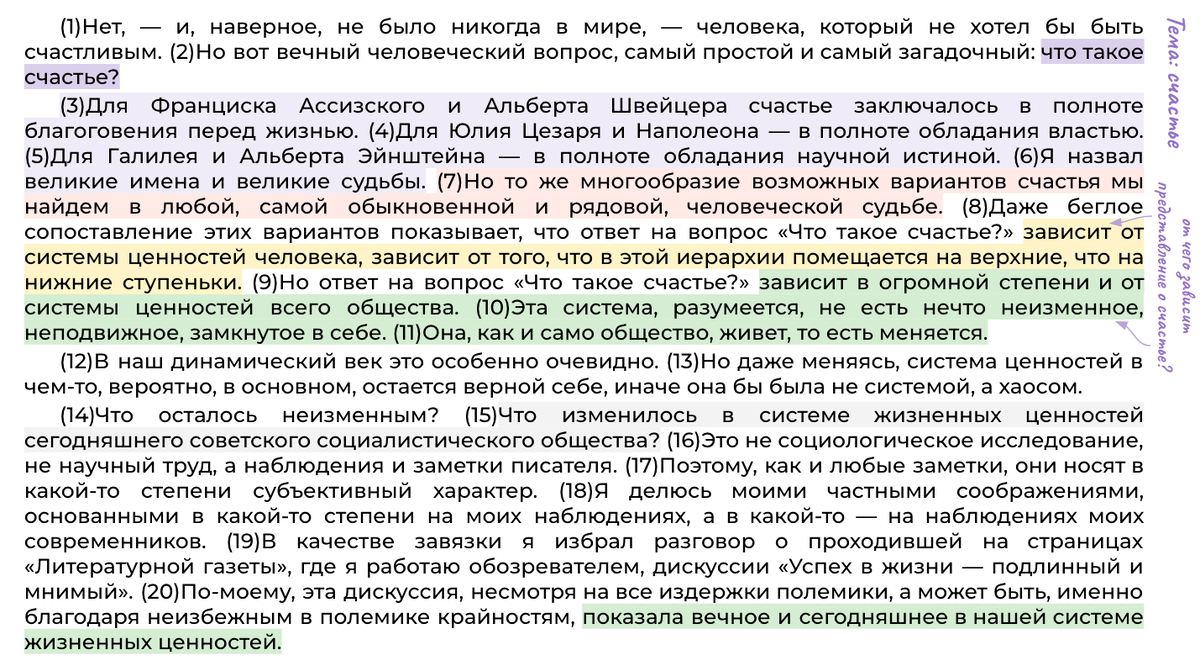 (3)Для Франциска Ассизского и Альберта Швейцера счастье заключалось в полноте благоговения перед жизнью. (4)Для Юлия Цезаря и Наполеона — в полноте обладания властью. (5)Для Галилея и Альберта Эйнштейна — в полноте обладания научной истиной. (6)Я назвал великие имена и великие судьбы. (7)Но то же многообразие возможных вариантов счастья мы найдем в любой, самой обыкновенной и рядовой, человеческой судьбе. (8)Даже беглое сопоставление этих вариантов показывает, что ответ на вопрос «Что такое счастье?» зависит от системы ценностей человека, зависит от того, что в этой иерархии помещается на верхние, что на нижние ступеньки. (9)Но ответ на вопрос «Что такое счастье?» зависит в огромной степени и от системы ценностей всего общества. (10)Эта система, разумеется, не есть нечто неизменное, неподвижное, замкнутое в себе. (11)Она, как и само общество, живет, то есть меняется.