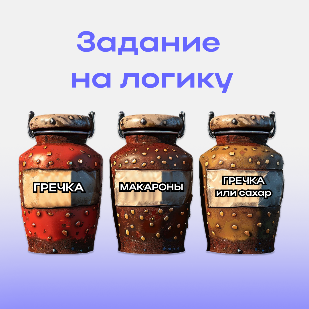 На первой банке написано «Гречка», на второй — «Макароны», а на третьей — «Гречка или сахар».
