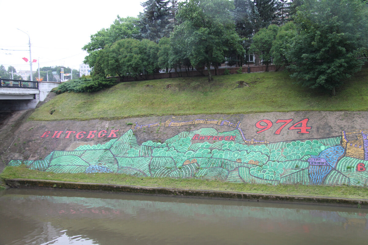 В устье Витьбы установлена скульптура "Рыбка". На второй фотографии в подборке присутствует изображение герба города Витебск с образом Иисуса Христа в профиль: