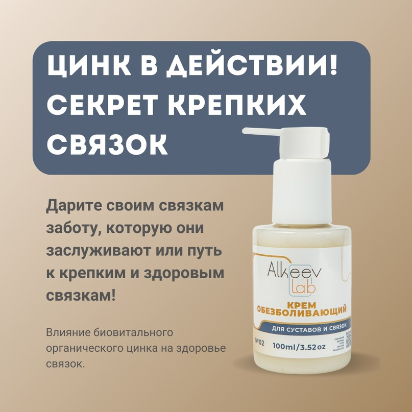 🌟 Привет, друзья! 🌟 Сегодня хочу поделиться с вами удивительной информацией о том, как укрепить свои связки и сделать их более здоровыми и гибкими. Каждый из нас хочет, чтобы наши связки были крепкими и гибкими на протяжении всей жизни, но возрастные изменения, травмы или растяжения могут стать барьером на пути к этой цели. Цинк и коллаген: Цинк помогает нашим связкам синтезировать коллаген, который делает их прочными и гибкими. С возрастом наш организм производит коллаген медленнее, поэтому цинк крайне важен для его производства. Также при травмах различной природы, например ушибы или растяжения, увеличение синтеза коллагена способствует ускоренному заживлению и восстановлению связок. Противовоспалительные свойства: Цинк также помогает уменьшить воспаление в связках. Это важно при возрастных изменениях или после травм, потому что хроническое воспаление может существенно замедлить заживление. Если вы хотите сохранить свои связки крепкими и гибкими, применяйте крем Алкеев ЛАБ № 02