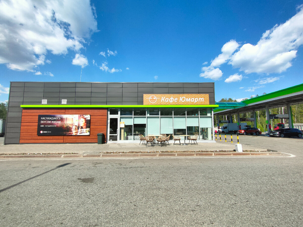 Ели в одном из кафе Юрмат при заправке Ирбис. Как я понимаю при этих заправках сеть кафе. Что могу сказать, в принципе такие и должны быть точки остановки - дозалить бензин, магазин с мелочами, туалет и кафе с вменяемые ценами. Я сразу вспоминаю наши заправки - возьми сосиску, кофе и разорись. А здесь чистенько, достаточно вкусно, на четверочку тянут. И по цене приемлемо.