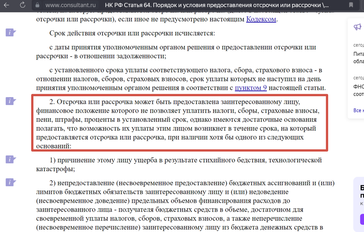 в отношении России, в том числе, привели к разрывам логистических цепочек, что в свою очередь привело к тому, что часть предпринимателей осталось без ранее заказанных товаров. На практике резкий разрыв логистических цепочек приводит к тому, что часть предпринимателей попросту не получают тот товар, который они ранее оплатили, либо такой товар за счет резкого скачка курса валют, либо стоимости логистики становится кратно дороже. Все эти проблемы приводят к появлению долгов, в том числе и перед налоговыми органами, а предпринимателя оказываются в шаге от банкротства. Не все знают, что с налоговой тоже можно договориться и на законных основаниях получить рассрочку, либо отсрочку в уплате налога, что прямо закреплено в статье 62 Налогового кодекса Российской Федерации: Для этих целей налоговой специально разработан сервис "Площадка реструктуризации долга"