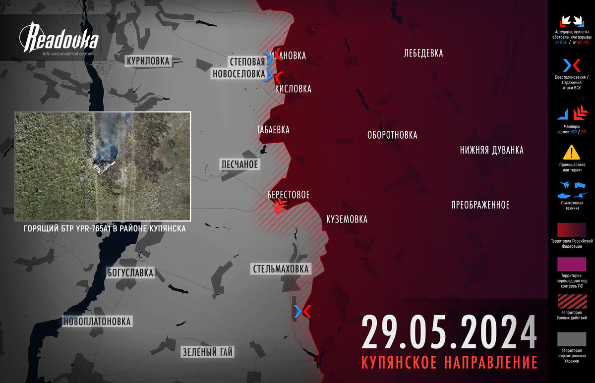 Редакция Readovka собрала важные события за 29 мая в разрезе СВО. Главным событием дня стала обострившаяся угроза попадания в «котел» сил киевского режима в селе Стельмаховка на Купянском направлении. Швеция передала Украине два борта ДРЛО, что свидетельствует о скором получении незалежной разрешения на применение импортного вооружения по объектам в глубине территории России. Редакция Readovka рассмотрела вопрос целесообразности выхода ВС РФ к реке Оскол южнее Купянска..