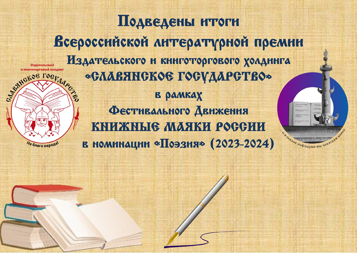 Сайт slav-gos.ru Дорогие друзья! Объявляем итоги Всероссийской литературной премии Издательского и книготоргового холдинга «СЛАВЯНСКОЕ ГОСУДАРСТВО» в рамках Фестивального Движения «КНИЖНЫЕ МАЯКИ РОССИИ» в номинации «Поэзия» (2023-2024 гг.). Представляем номинантов: Вероника Богданова Мария Камушкова Артём Ковальчук Татьяна Лебедева Сергей Протянов Виталий Свирин Финалисты премии: Вероника Богданова Мария Камушкова Татьяна Лебедева Виталий Свирин Победители и призёры: Призёр (3 место) — Мария Камушкова (230 б.) Призёр (2 место) — Виталий Свирин (260 б.) Победитель премии — Вероника Богданова (270 б). Номинанты, финалисты и призёры награждаются Специальными Именными Дипломами. Победитель награждается Специальным Именным Дипломом, а также сертификатом на бесплатную публикацию в литературно-художественном журнале «Новая Литература России» (формат А4, 1 стр.). Состав жюри: Председатель жюри Алла Викторовна Иванникова (Дементьева) — поэт, писатель, публицист, эссеист, пр