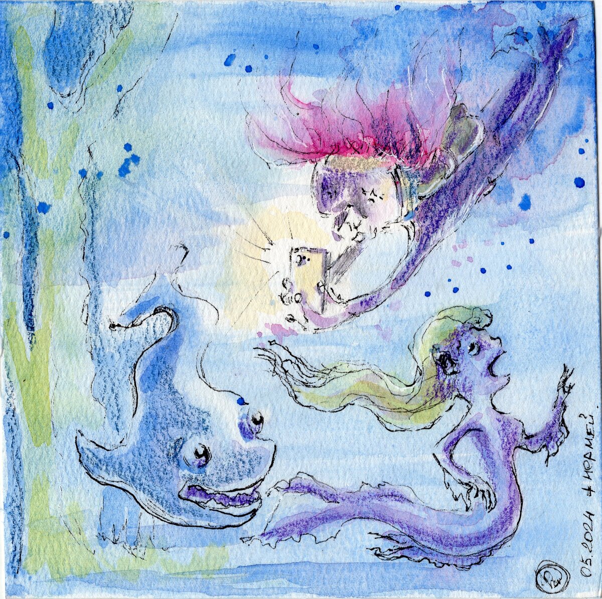 И я решила, что "ну как-то не сошлись в этот раз звезды". А на следующий день понимаю, что у меня есть идеи и может быть я успею больше, чем 15 артов сделать. Ну что.. поехали успевать?) На память: ну это шутливый и очень быстрый набросок о том, что сейчас больше всего любят делать на память. Фото! Еще лучше фото с автографом. Только акуленок и русалка явно не хотят радовать фотографа и.. убегают! Жемчуг: делала очень быстрый опять же арт с немножко грустной русалкой. Получилось вот так. Чуть-чуть напоминает мне одну из героинь игры с моими друзьями. Шипы: быстро-поспешный арт с авангардной русалкой, которая выбирает СВОЮ моду. Не все арты получается делать быстро. Сегодня я выложила видео с одним из артов, над которыми работаю: И таблица с темами арт-марафона сейчас выглядит вот так. Уже самой интересно справлю