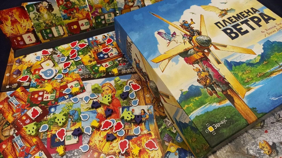 Правила у игры довольно просты. Каждый игрок получает планшет персонажа, на котором будет размещать тайлы леса, перемещать по ним своих наездников ветра и строить поселения. Для этого игроки будут ходить по очереди, разыгрывать карты и активировать разные эффекты. Эффекты будут приносить разные ресурсы, удалять жетоны загрязнений, позволять строить новые тайлы леса. Также игроки будут выполнять цели на картах поселений. Игра закончится, когда кто-то построит 5-е поселение. ПО начисляются за постройку тайлов леса, очистку планшета от жетонов загрязнений, за количество построенных святилищ. Ну и очень много ПО можно получить за выполнение целей карт поселений, я бы сказал, примерно половину от итоговой суммы.