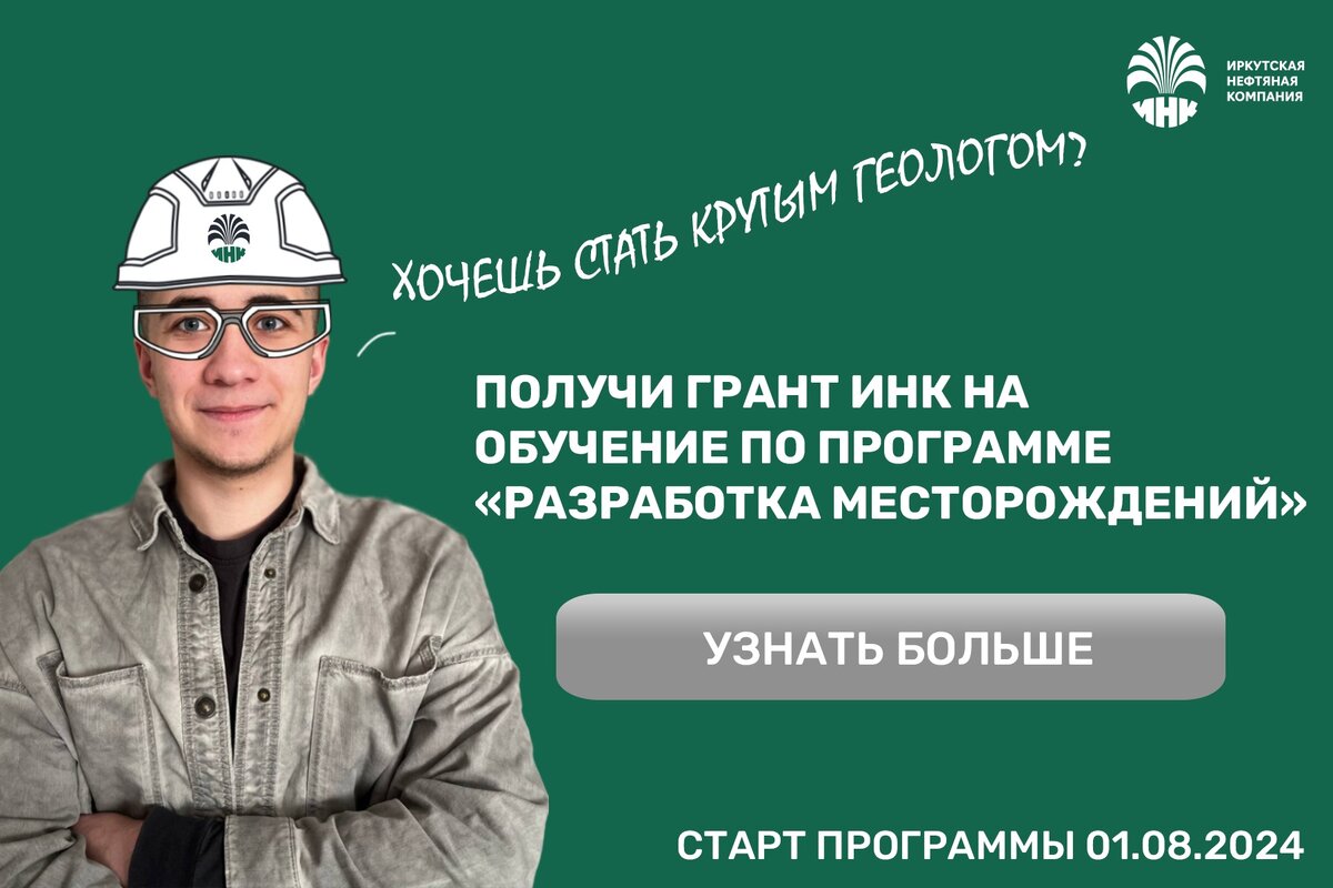 Отдаем в хорошие руки грант на миллион рублей! Назначение гранта — годовое обучение по программе «Разработка месторождений» в Томском политехническом университете, а хорошие руки — это вы, выпускники естественно-научных факультетов со средним баллом от 4. Подойдет любое базовое естественно-научное образование (математика, физика, химия, информатика) и профильная программа в хорошем техническом вузе. Грант ИНК — это все включено. Оплата обучения, стипендия, проживание. Заявки принимаются до 30 июня 2024 года по почте Bazhenova_OM@irkutskoil.ru. Обучение стартует 1 августа. Это отличный шанс за год стать классным геологом и прийти работать в нефтяную компанию. Возможно, именно вы откроете следующие месторождения ИНК в Восточной Сибири! Чем хороша работа геологов в нефтегазовой отрасли — рассказывают наши коллеги. Выпускник Томского филиала магистратуры университета Хериот-Ватт (с 2022 года входит в состав Томского политехнического университета как «Центр Хериот-Ватт»), факультет Petrole