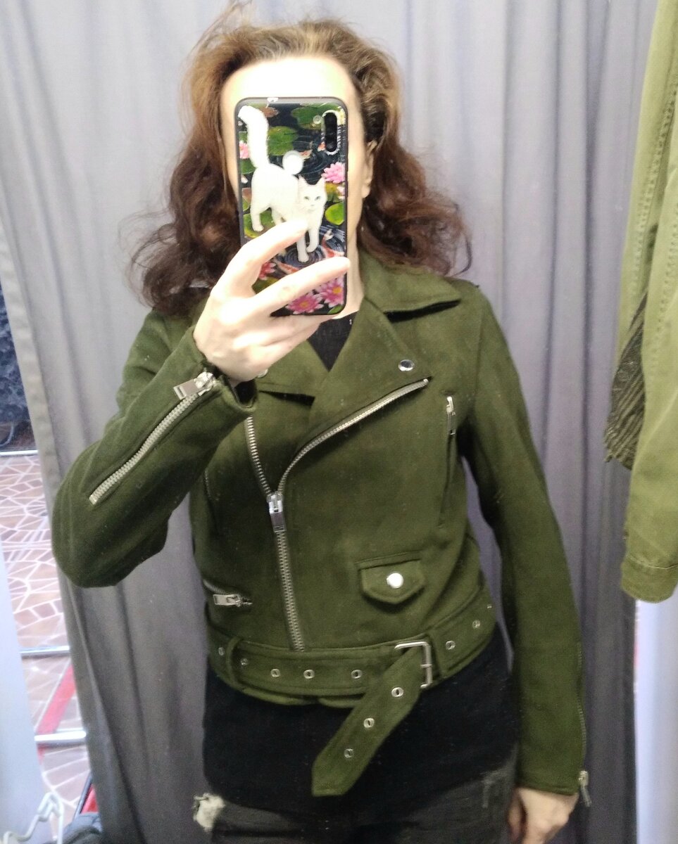 Здравствуйте) С распродажи "всё по 150 рублей" я ушла с покупочками. Выкинула я свою чёрную косуху из-за облезающего воротника, не собиралась покупать новую, не так часто я ношу такие куртки, предпочитаю удобные парки. Но свято место пусто не бывает))). Нашла косуху из искусственной замши тёмного зелёного цвета. Ходила с ней в обнимку, думала, то ли брать, то ли не брать. Сомнения рассеял муж, сказав, что за такие деньги новую косуху надо брать и думать тут нечего. Примерила я её в секонде раза три)). Классическая косуха с поясом и маленьким карманчиком, ткань отличная, куртка довольно тяжёлая, молнии сияют, все в рабочем состоянии. С камуфляжной футболкой. С бежевыми джинсами. С юбкой. Понимаю, что надо носить с тёмными колготами, но в такую жару я не смогла себя уговорить их надеть. Я пока фоткалась почти сварилась в куртке((. Целая куча бумажек у куртки, она новая. Секондовские боги нынче ко мне хорошо расположены)). Зимняя куртка сыну за 150 рублей. Тоже новая, трикотажные манже