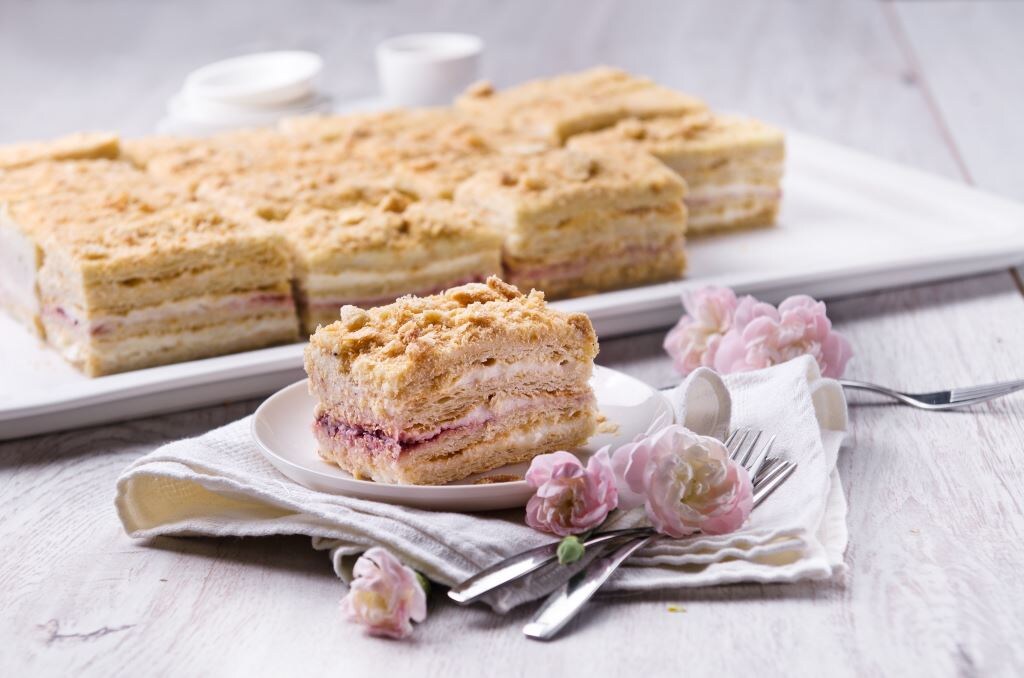 Наполеон – это слоеный торт с начинкой из заварного крема, который является одним из самых популярных десертов. Домашний наполеон каждая хозяйка делает по-своему, кто-то добавляет джемы, кто-то делает разные крема, например шоколадный, а другие добавляют свежие ягоды и кусочки фруктов. Но как появился этот восхитительный десерт? Считается, что родиной десерта была Франция, где Наполеон имел другое название – «Мильфей», что в переводе с французского означает «тысяча слоев». Для его приготовления подготавливалось большое количество тонких коржей, которые пропитывали кремом, а затем уже готовое изделие оставляли в холодном месте на сутки для того, чтобы оно настоялось. Первые упоминания о Мильфее появились в книге «Французский повар» авторства Франсуа Варена. Данная книга являла собой первый профессиональный сборник рецептов, который был доступен для любой хозяйки. О том, как слоеный десерт появился также рассказывают и несколько легенд. Первая версия гласит, что рецепт из книги Варена ус