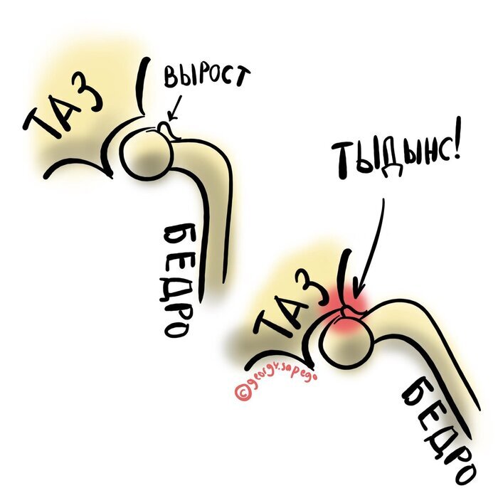 Вчера меня спрашивали по поводу шпагат-студии. Насколько это полезно или вредно. Поясняю. Это никогда не бывает полезно, потому что в этом нет смысла. Это всегда по крайней мере немного вредно. Так зачем это делают? На шпагат пытаются сесть для того, чтобы добиться результата. Ну то есть, когда мы занимаемся спортом, то предела совершенству нет. Кто-то бегает километр, потом пять, потом бежит малый марафон и может так продолжать очень долго. Где же предел мастерству? Со шпагатом другое дело. Шпагат — это понятие качественное. На него или сел, или не сел. Шпагата тоже нужно добиваться и достигать через пот и боль. Зато где-то впереди маячит финиш. Сели на шпагат и достигли цели. Видимо, какое-то в этом и есть удовлетворение. А вы чего ждете от шпагата? Первый подвох Теперь подвох. Сесть получится не у всех. Иногда это просто физически невозможно. Иногда от этого больно. Иногда это разрушит вам тазобедренный сустав. Интересно? Тогда идем дальше. Тазобедренные суставы состоят из похожих н