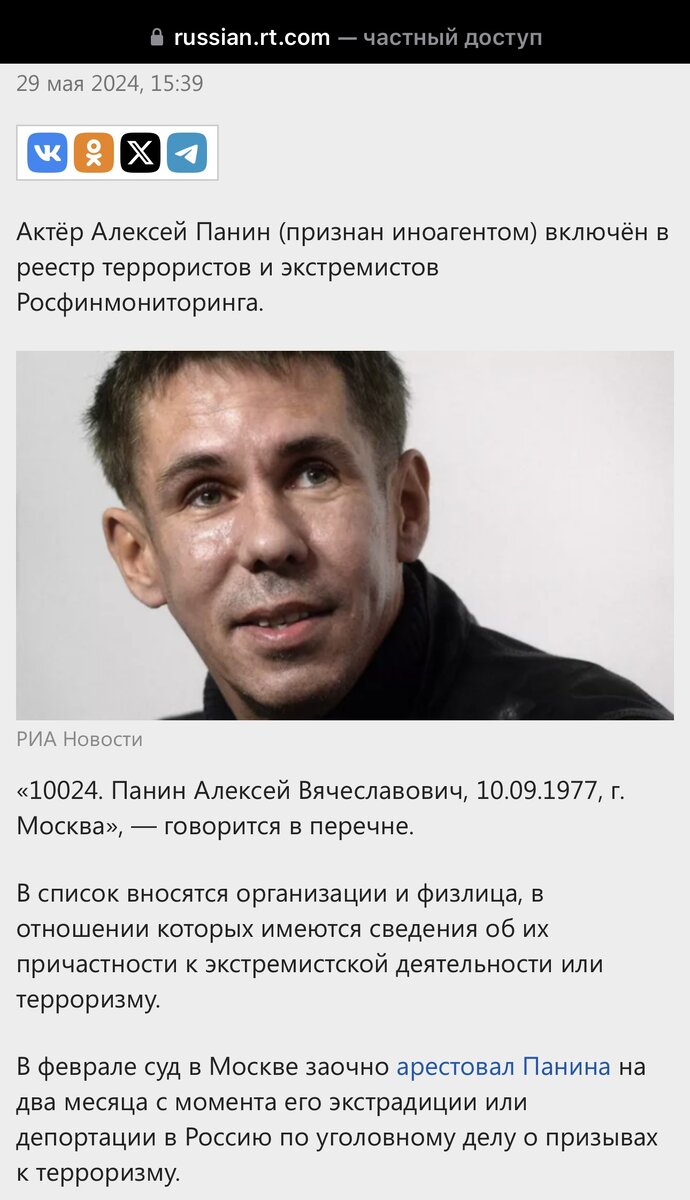 Во многих респектабельных и богатых СМИ Панина сегодня называют «иноагентом»: При этом в реестре я его так и не смог найти. Но Алексей Панин действительно только что включен в реестр террористов и экстремистов Росфинмониторинга. Его имя появилось в списке, опубликованном на сайте ведомства. По закону внесенные в реестр лишаются возможности пользоваться банковскими услугами, в том числе открывать счета в банках, использовать деньги на банковских счетах. Попадание в список означает, что против этих лиц возбуждены дела по «экстремистским» и «террористическим» статьям Уголовного кодекса России. 15 февраля Панина заочно арестовали по обвинению в оправдании терроризма. Дело завели в мае 2023 года, тогда же его объявили в розыск. Поводом стали комментарии актера по поводу взрыва на Крымском мосту: следствие посчитало, что он оправдал атаку на переправу. Панин сказал, что никогда не оправдывал терроризм, но признал, что действительно высказывался о взрывах на мосту.