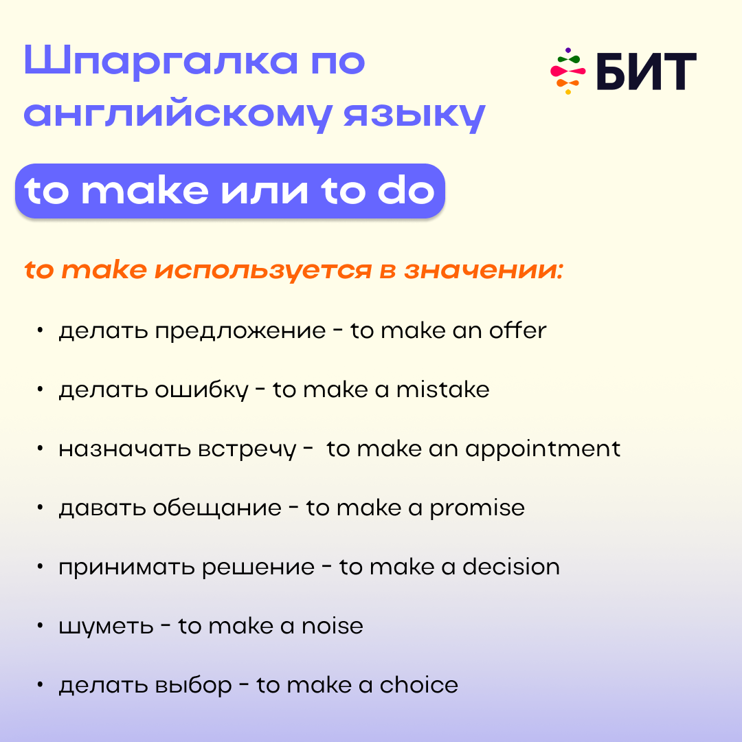 Подготовили шпаргалку по английскому языку.Ученики часто путают, в каких случаях использовать to make, а в каких to do? Запоминайте устойчивые сочетания с помощью наших карточек.А какие еще устойчивые сочетания с to make и to do вы знаете?