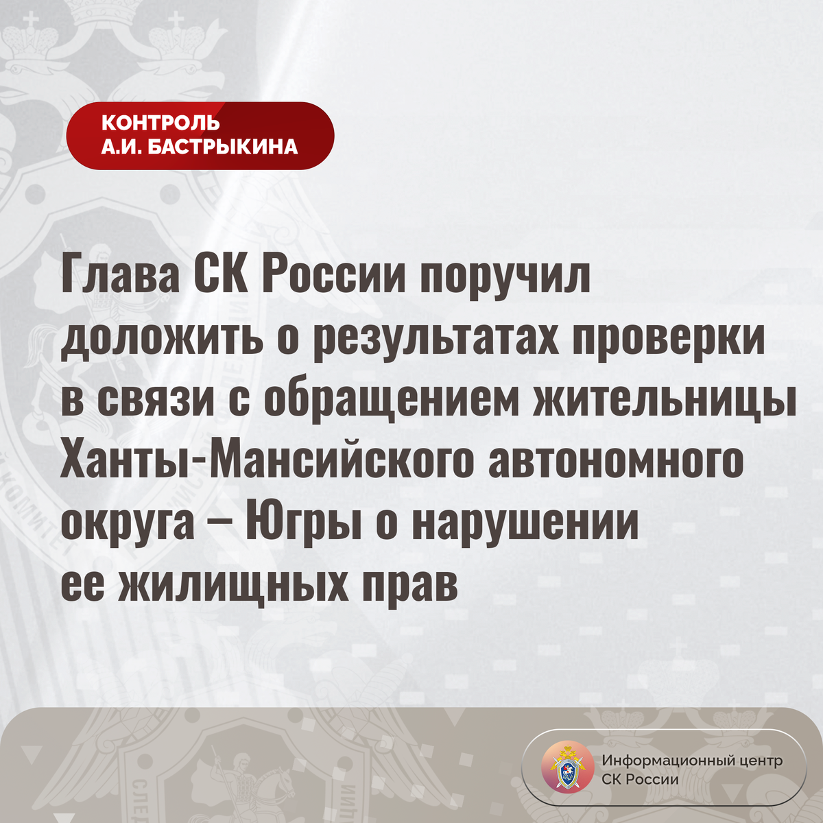 Глава СК России поручил доложить о результатах проверки в связи с обращением жительницы Ханты-Мансийского автономного округа – Югры о нарушении ее жилищных прав