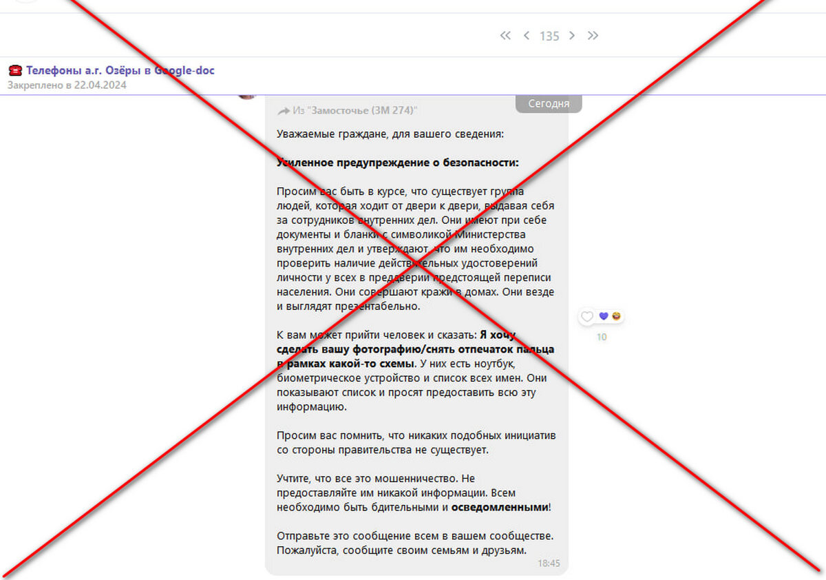 В Гродненских чатах стала распространяться информация о том, что по домам якобы ходят злоумышленники и под предлогом скорой переписи населения просят показать документы, заполнить разные бланки, а после их визита у людей пропадают ценности и деньги, сообщает УВД Гродно. «Небезразличные» граждане нагнетают обстановку и всё это под предлогом заботы о пожилых. Подобных заявлений в милицию не поступало, а проводить перепись населения в Беларуси планируется только в 2030 году. В общем, не будьте излишне доверчивыми, но и не устраивайте панику на ровном месте. Информацию берите из официальных источников, а не из «дворовых» чатов. ЧИТАЙТЕ ТАКЖЕ: Telegram начнет помечать фейки. По какому принципу будут